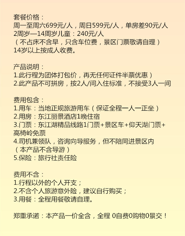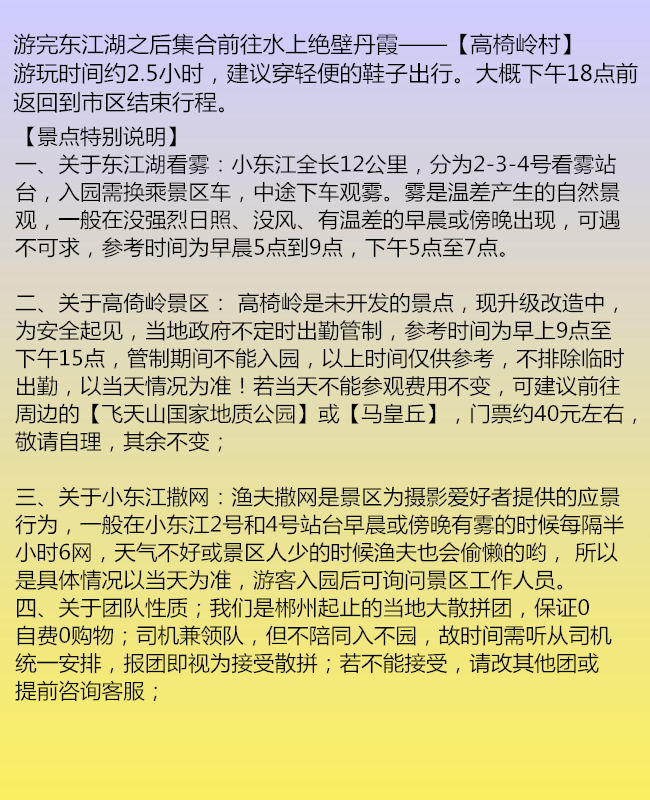 第二天:東江湖景區(qū)一霧漫小東江一高椅嶺--郴州送團(tuán)早起酒店出發(fā)前往東江湖售票廳換乘景區(qū)車到霧漫小東江6:30-9:30,景區(qū)有安排漁夫撒網(wǎng)表演哦。觀后沿小東江觀霧棧道往上游走到3號或者4號站臺,繼續(xù)乘坐景區(qū)環(huán)保車前往終點(diǎn)站--東江大壩旅游碼頭。抵達(dá)大壩后可前往【龍景峽谷瀑布群】(參考時(shí)間約1.5小時(shí)龍景峽谷全線游程2.5公里??瓷骄埃絼荻盖停嗌降未?,古木參天;觀水景,一條清澈的溪流在峽谷中穿行,瀑布成群沿途可以觀賞到煙竹山瀑布、龍景瀑、龍吟瀑、三疊瀑、龍卷瀑、鴛鴦瀑等形態(tài)各異的瀑布和古松坳、連理樹、龍鱗石等干姿百態(tài)的景點(diǎn)。