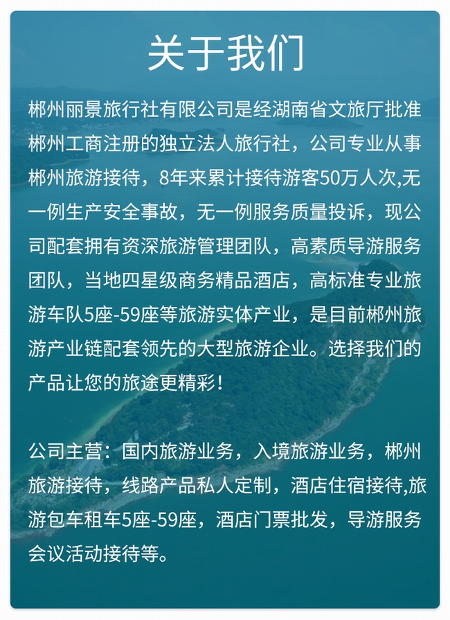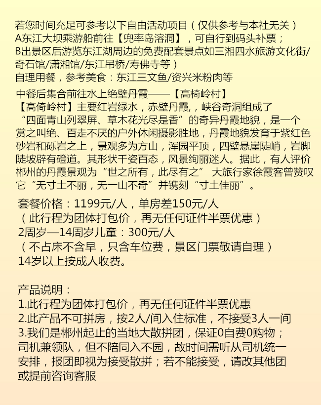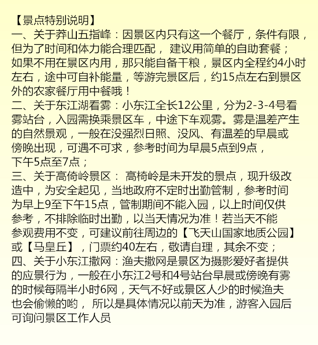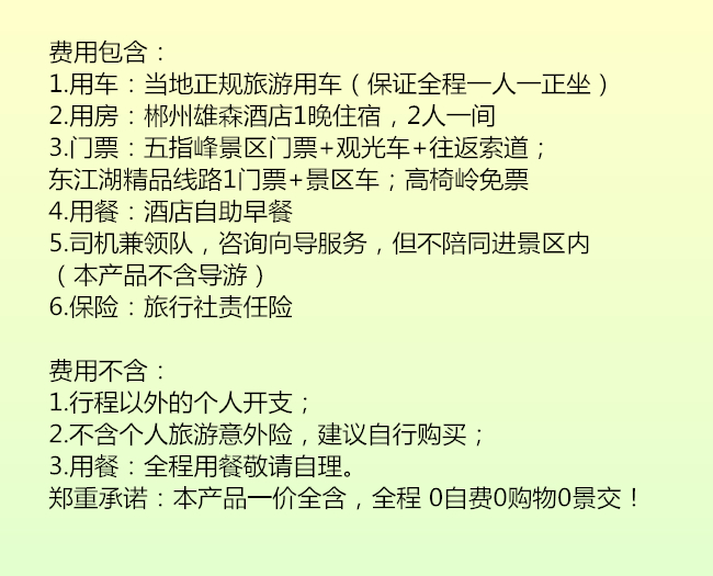 DAY1:郴州市區(qū)接團(tuán)一莽山·五指峰景區(qū)一入住郴州雄森酒店8點(diǎn)左右郴州市區(qū)(具體時(shí)間地點(diǎn)以出發(fā)前一天工作人員通知為準(zhǔn))接貴客前往【莽山·五指峰景區(qū)】,由中景信集團(tuán)的歷數(shù)三年,巨資投入、超前規(guī)劃、人性設(shè)計(jì)、精工建設(shè)及匠心打造,南中國(guó)最長(zhǎng)懸空棧道:總長(zhǎng)約8公里,海拔1400米至1600米,兩層棧道,全程無(wú)障礙觀光環(huán)線,登高山、臨絕壁如履平地,盡享“非人”奇遇。乘坐中國(guó)目前最長(zhǎng)索道單線的觀光纜車(chē);游玩時(shí)間約5小時(shí)。中餐晚餐自理,晚上入住郴州雄森國(guó)際假日酒店。第二天:霧漫小東江一龍景峽谷一高椅嶺--郴州送團(tuán)早上6點(diǎn)半左右酒店接團(tuán)前往【霧漫小東江】,偉大的思想家孔子曾經(jīng)說(shuō)過(guò)“仁者樂(lè)山,智者樂(lè)水”而東江湖正是有山有水它集江南名山秀水的旖旎風(fēng)光于一體,自然景觀與人文景觀交相輝映。景區(qū)面積200平方公里,160平方公里的湖面煙波浩淼平均水深51米,最深處達(dá)157米,蓄水量達(dá)81.2億立方米的湖水 晶瑩透澈,被譽(yù)為“湘南洞庭”,數(shù)十個(gè)島嶼星羅 其中,被稱(chēng)為“東方瑞士“溫馨提示:霧漫小東江屬于溫差產(chǎn)生的自然景觀,可遇不可求哦!景區(qū)有安排漁夫撒網(wǎng)表演哦。觀霧后沿小東江觀霧棧道往上游走到3號(hào)或者4號(hào)站臺(tái),繼續(xù)乘坐景區(qū)環(huán)保車(chē)前往終點(diǎn)站一東江大壩旅游碼頭。抵達(dá)大壩后可前往【龍景峽谷瀑布群】(參考時(shí)間約1.5小時(shí))龍景峽谷全線游程2.5公里。看山最山勢(shì)陡峭,青山滴翠,古木參天;觀水景,一條清澈的溪流在峽谷中穿行,瀑布成群。沿途可以觀賞到煙竹山瀑布、龍景瀑、龍吟瀑、三疊瀑、龍卷瀑、鴛鴦瀑等形態(tài)各異的瀑布和古松坳、連理樹(shù)、龍鱗石等千姿百態(tài)的景點(diǎn)。