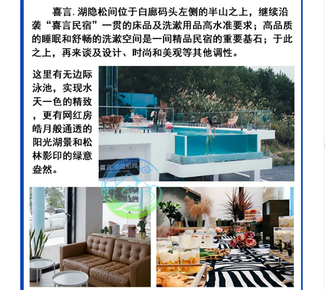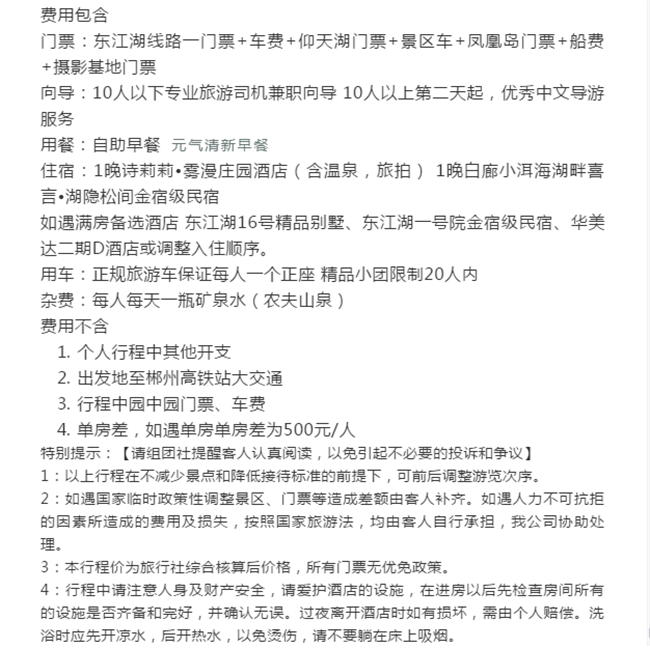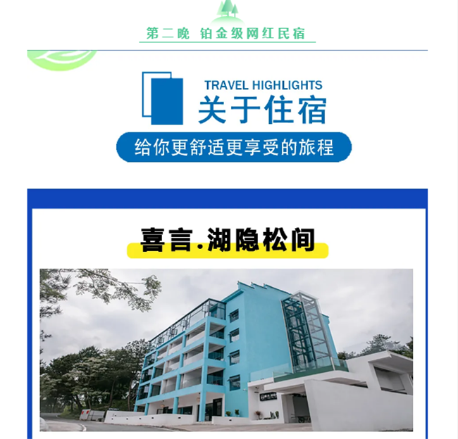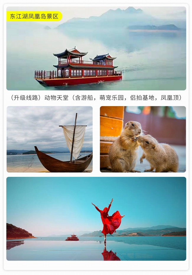 早晨酒店早餐后前往【東江湖景區(qū)】可參觀中華奇觀霧漫小東江,小東江水質(zhì)清澈明凈各項(xiàng)指標(biāo)均達(dá)到了國(guó)家一級(jí)飲用水標(biāo)準(zhǔn)。每年3-11月,每當(dāng)旭日東升或夕陽(yáng)西下,整個(gè)小東江云蒸霞蔚,朦朧縹紗,仿佛進(jìn)入仙境。之后乘車前往--東江大壩旅游碼頭。東江湖湖面面積160平方公里,湖面煙波浩淼,平均水深51米,深處達(dá)157米,蓄水量高達(dá)81.2億立方米,相當(dāng)?shù)挠诎雮€(gè)洞庭湖大,因此被譽(yù)為“湘南洞庭”,數(shù)十個(gè)島嶼星羅其中,被稱為“東方瑞士”之后參觀【龍景峽谷景區(qū)】,峽谷內(nèi)有堪稱南國(guó)的瀑布群--龍景十八瀑:是國(guó)內(nèi)天然氧吧!是我國(guó)目前瀑布密集最高的景區(qū),有大小瀑布26處,水潭18個(gè),是國(guó)內(nèi)罕見(jiàn)的高負(fù)離子區(qū)。中午自理中餐后前往前往江湖【白廊小洱海最美環(huán)湖公路】,沿途參觀南國(guó)生態(tài)休閑漁村,吉尼斯世界大魚鍋。東江湖環(huán)湖路共長(zhǎng)14公里是以湖光山色為主的觀景棧道,比千島湖安靜質(zhì)樸堪比美國(guó)66號(hào)公路,之后乘游船暢游大東江--登【東江湖鳳凰島】位于東江湖西北部,位于東江湖白廊片區(qū)湖的中央,是東江湖能在島頂360度觀湖景的地方。鳳凰島以“動(dòng)物天堂、人的天堂"為主題,羊駝、孔雀、王松鼠、大嘴鳥(niǎo)、獼猴、珍珠雞、火雞等諸多可愛(ài)的動(dòng)物自然放養(yǎng)其中。在這里你會(huì)有各色驚奇發(fā)現(xiàn),可愛(ài)的動(dòng)物隨時(shí)與你不期而遇。特別贈(zèng)送東江湖最火的【網(wǎng)紅打卡基地】。網(wǎng)紅攝影基地 Get網(wǎng)紅拍照地點(diǎn),輕松稱霸朋友圈讓你享受不用排隊(duì)慢慢拍的自由。晚上晚餐自理,入住鉑金民宿喜言湖隱松間(注鉑金級(jí)為民宿最高等級(jí))