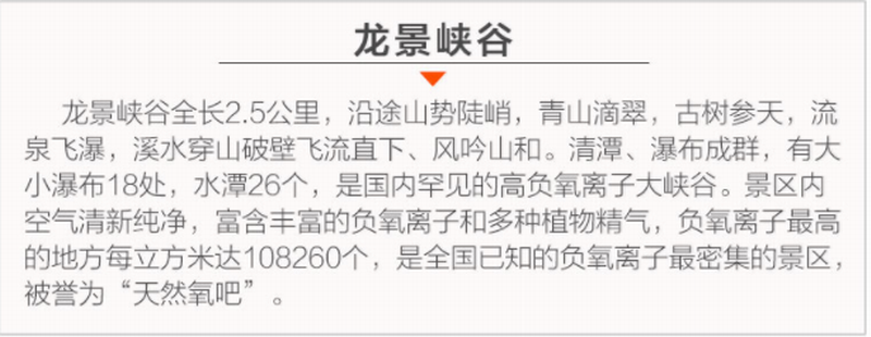 9點集合前往亞洲——東江大壩旅游碼頭。東江湖景區(qū)面積200平方公里,160平方公里的湖面煙波浩淼,平均水深51米,深處達157米,因為水體較深,所以蓄水量相當大。達81.2億立方米的湖水晶瑩透澈,相當?shù)挠诎雮€洞庭湖,因此被譽為“湘南洞庭”,數(shù)十個島嶼星羅其中,被稱為“東方瑞士”。到達東江大壩旅游碼頭后前往龍景峽谷景區(qū)。龍景峽谷位于東江大壩右側(cè),峽谷內(nèi)有堪稱南國大的瀑布群--龍景十八瀑;是國內(nèi)大的天然氧吧!沿途山勢陡峭,青山滴翠,古木參天,清潭、瀑布成群,是我國目前瀑布密集高的景區(qū),有大小瀑布26處,水潭18個,是國內(nèi)罕見的高負離子區(qū)。龍呤瀑、鴛鴦瀑、東江大壩等景點,中午自行在東江大壩用中餐。