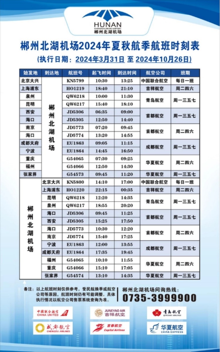 郴州旅游--郴州北湖機場新增航線!北湖機場2024年夏季航班時間表