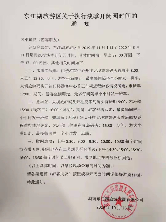 初冬11月東江湖旅游區(qū)已進(jìn)入游客接待淡季,經(jīng)研究決定東江湖旅游區(qū)于2019年11月1日至2020年3月31日期間執(zhí)行淡季開閉園時(shí)間。近期內(nèi)有意向前往東江湖景區(qū)旅游的朋友,請注意參照通知上的時(shí)間調(diào)整行程時(shí)間。