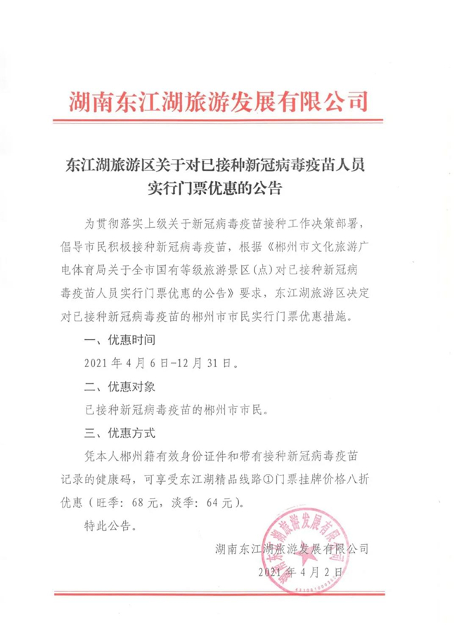 2021年4月6日-12月31日。 二、優(yōu)惠對(duì)象 已接種新冠病毒疫苗的郴州市市民。 三、優(yōu)惠方式 憑本人郴州籍有效身份證件和帶有接種新冠病毒疫苗記錄的健康碼,可享受東江湖精品線(xiàn)路①門(mén)票掛牌價(jià)格八折優(yōu)惠(旺季:68元,淡季:64元)。